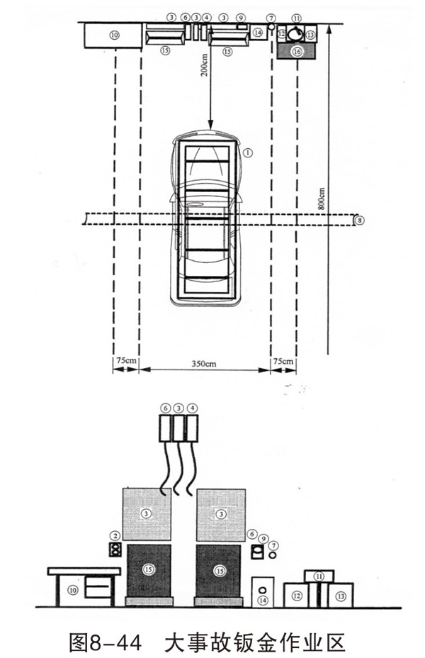 損傷修復和焊接作業(yè)區域可各設置 4~6個(gè)工位,每個(gè)工位的面積約400cm×800cm,每個(gè)工位配相應的設備和操作臺(架)。車(chē)身校正作業(yè)一般設一個(gè)工位,面積500cm×800cm。如條件允許,可以根據不同類(lèi)型的校正架,設置2~3個(gè)工位。