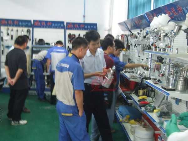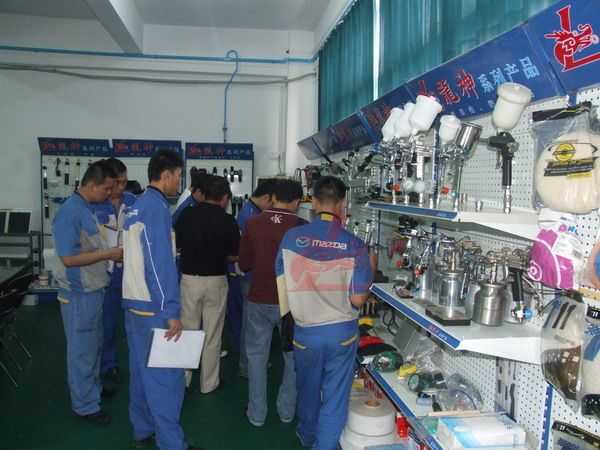 龍神講師向一汽馬自達的師傅介紹意大利威彩噴槍的優(yōu)點(diǎn)