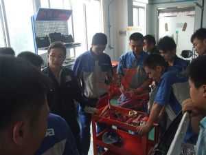 一汽馬自達的師傅們圍觀(guān)聽(tīng)取汽車(chē)鈑金快修工藝注意事項