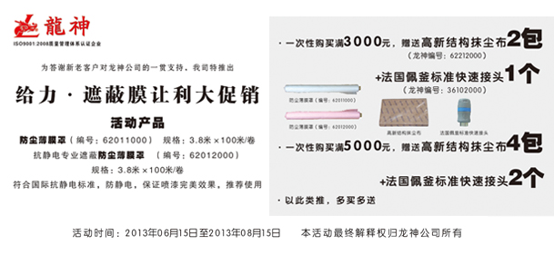 一次性購買(mǎi)滿(mǎn)3000元,贈送高新結構抺塵布(龍神編號:62212000)2包+法國佩釜標準快速接頭(龍神編號:36102000)1個(gè)