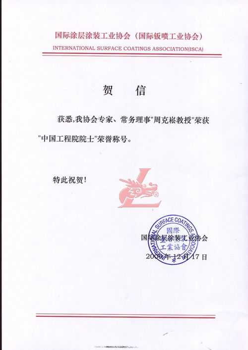 賀國際涂層涂裝工業(yè)協(xié)會(huì )專(zhuān)家常務(wù)理事克崧教授榮獲“中國工程院院士”[龍神秘書(shū)單位處]