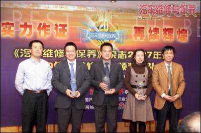頒獎嘉賓與獲獎廠(chǎng)商合影留念:中間為珠海市龍神有限公司銷(xiāo)售經(jīng)理張宏義