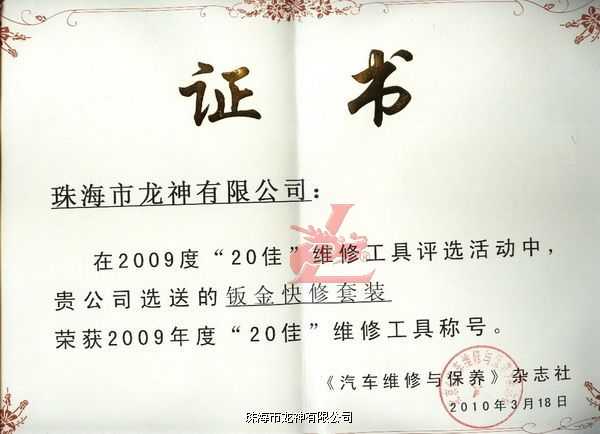2010年北京汽保春季展期間,由中國汽車(chē)保修設備行業(yè)協(xié)會(huì )和《汽車(chē)維修與保養》雜志共同舉辦的2009年度“20佳”維修工具頒獎典禮,于2010年3月18日在北京江河水鳥(niǎo)巢麗景隆重舉行,龍神“鈑金快修套裝”在眾多候選產(chǎn)品中脫穎而出,獲得本屆評審委員會(huì )專(zhuān)業(yè)評委的一致認可:符合產(chǎn)品創(chuàng )新性、實(shí)用性、效率性,可幫助企業(yè)提高工作效率,授予“中國汽車(chē)維修市場(chǎng)2009年度20佳”榮譽(yù)稱(chēng)號。