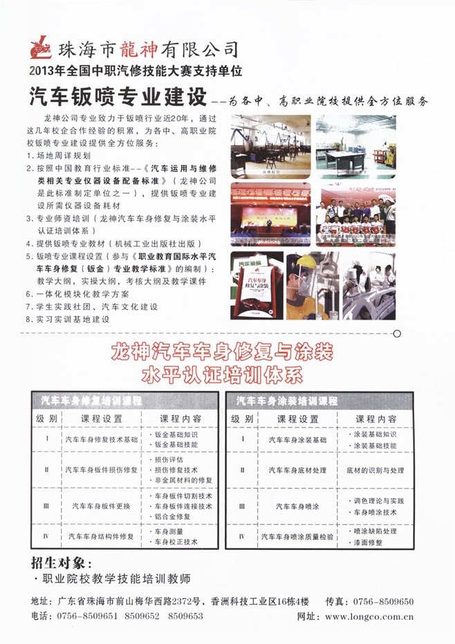 龍神公司專(zhuān)業(yè)致力于鈑噴行業(yè)近20年,通過(guò)這幾年校企合作經(jīng)驗的積累,為各中、高職業(yè)院校鈑噴專(zhuān)業(yè)建設提供全方位服務(wù):