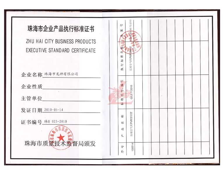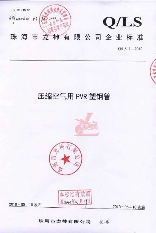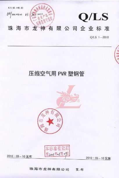 2010年5月珠海市龍神有限公司“壓縮空氣PVR塑鋼管”得到珠海市質(zhì)量技術(shù)監督局認可,特此頒發(fā)“壓縮空氣PVR塑鋼管企業(yè)執行標準”,龍神公司在嚴格執行標準下,保證產(chǎn)品質(zhì)量。