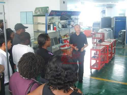 龍神總經(jīng)理彭小龍向海外代表團介紹“龍神鈑噴培訓中心”