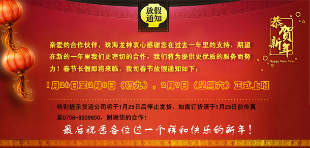 2014年春節放假通知 2014-01-16 10486 親愛(ài)的合作伙伴,珠海龍神衷心感謝您在過(guò)去一年里的支持,期望在新的一年里我們更密切的合作,我們將為提供更優(yōu)質(zhì)的服務(wù)而努力!春節長(cháng)假即將來(lái)臨,我司春節放假通知如下:1月26日至2月8日(初九),2月9日(星期六)正式上班。特別提示貨運公司將于1月25日后停止發(fā)貨,如需訂貨請于1月25日前傳真至0756-8509650,謝謝您的合作!最后祝愿各位過(guò)一個(gè)祥和快樂(lè )的新年!