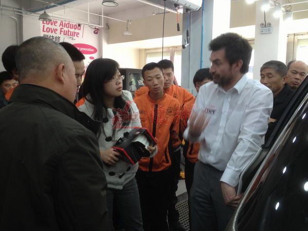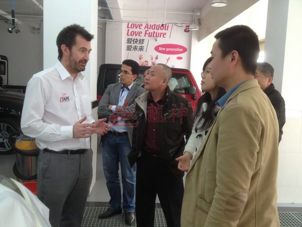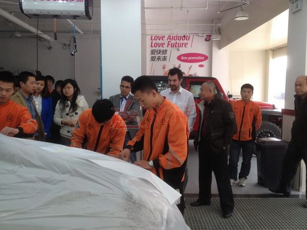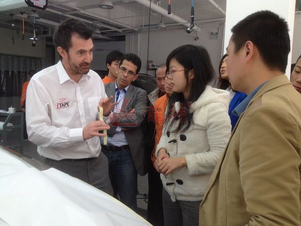 本司訊:2013年4月北京晴空萬(wàn)里,龍神公司特邀英國專(zhuān)家一行五人,來(lái)到了北京車(chē)爵士進(jìn)行汽車(chē)噴涂遮蔽技術(shù)交流。首先公司一行了解車(chē)爵士的汽車(chē)噴涂情況及詢(xún)問(wèn)了使用的遮蔽工具情況。隨后英國專(zhuān)家針對在汽車(chē)噴漆時(shí)難噴涂的車(chē)門(mén)縫隙、玻璃死角等地方的專(zhuān)業(yè)遮蔽工具的演示。車(chē)縫泡沫膠:用于車(chē)身所有縫隙的遮蔽,有效隔離及遮蔽漆霧噴入車(chē)縫里。