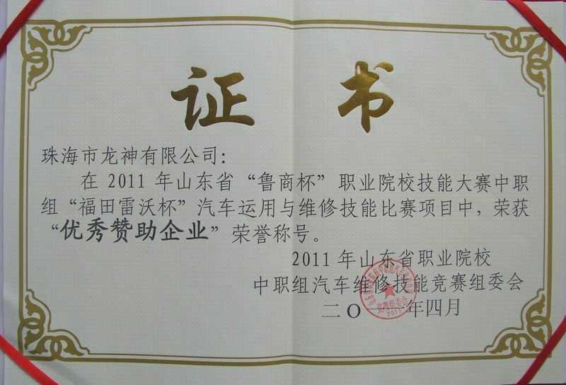 4月7日,在「2011年山東省“魯商杯”職業(yè)院校技能大賽」中職組“福田雷沃杯”汽車(chē)運用與維修技能大賽項目中,我司榮獲“優(yōu)秀贊助企業(yè)”榮譽(yù)稱(chēng)號。