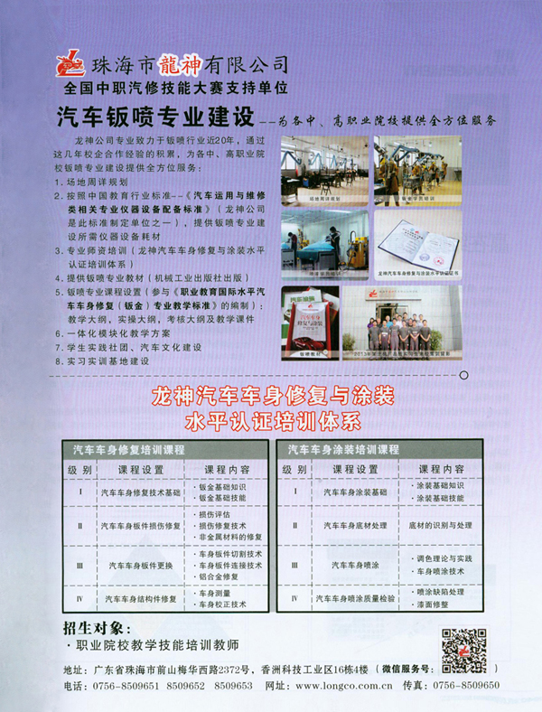 以珠海市龍神有限公司與廣東科學(xué)技術(shù)職業(yè)學(xué)院汽車(chē)車(chē)身修復專(zhuān)業(yè)校企合作為案例,通過(guò)教學(xué)模式設計、學(xué)科設置、場(chǎng)地規劃、實(shí)訓設備配置標準、師資培訓、教材選用以及學(xué)生就業(yè)渠道建設等多個(gè)方面進(jìn)行講解,全面輔助各交職院校進(jìn)行汽車(chē)車(chē)身修復專(zhuān)業(yè)建設。