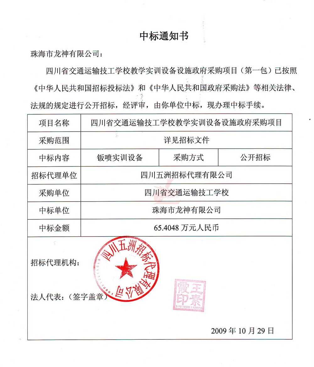 [新聞中心]珠海市龍神有限公司經(jīng)過(guò)長(cháng)時(shí)間的籌備已成功中得四川省交通運輸技工學(xué)校教學(xué)實(shí)訓設備設施政府采購項目標,這是珠海市龍神有限公司一種實(shí)力的表現。說(shuō)明了珠海龍神的品牌在不斷的加強、深化。